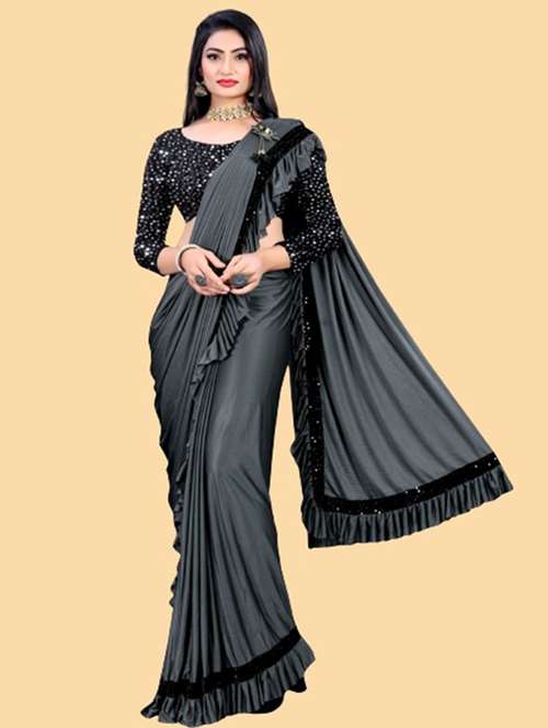 Ready to Wear Saree, Fabric: Lycra, Work : Squence Embroidered, Saree Length of 5.25 meters in Grey Color, The saree comes with a blouse piece 0.75 meter Velvet Squence Embroidered Work. It is unstitched and can be altered according to your fit and style that you require