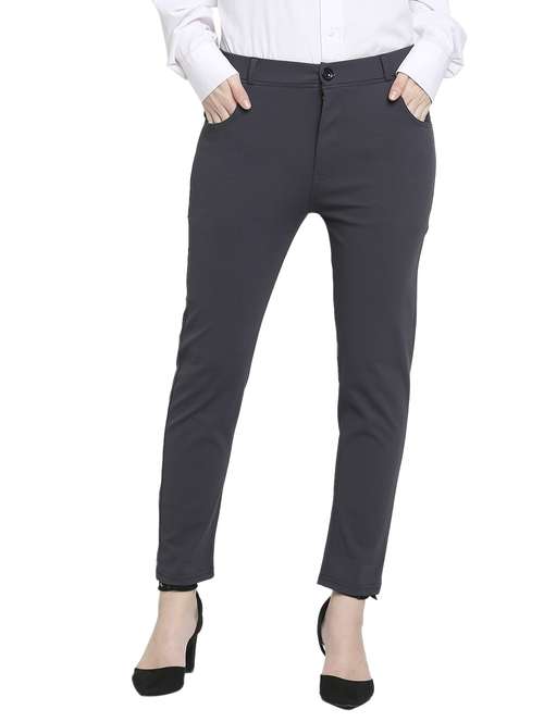 Feel compact & comfortable all day long. These ankle legth formal trouser in classy dark grey color will give you sharp look. it's high waist fitting, cotton lycra fabric will make you feel easy.