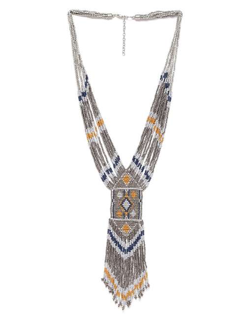 Grey and navy blue silver-plated artificial beaded tasselled necklace