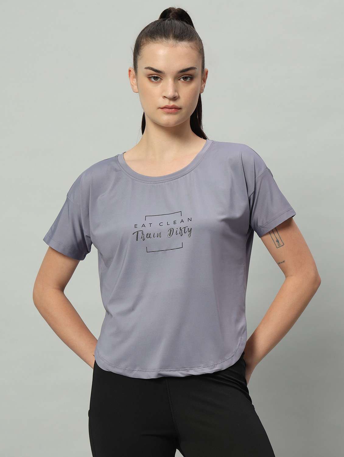 - » women grey typographic round neck t-shirt