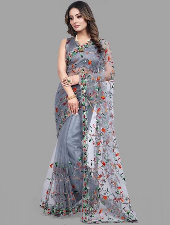 Color : Grey, Made from high-quality Net Fabric Embroidred Saree, giving the saree a stunning look and feel.With a length of 5.50 meters and an additional 0.80 meters of Banglory unstitched blouse material.Available in various colors, this saree is perfect for weddings, parties, and other special occasions.Please be aware that screen settings or photography lighting may cause tiny variations in the product's colour, and that any additional accessories displayed are solely for modelling.