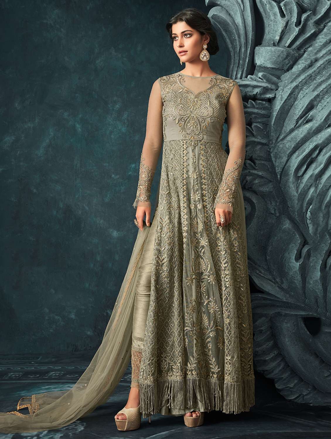 tonal embroidered kalidaar suit with fringes