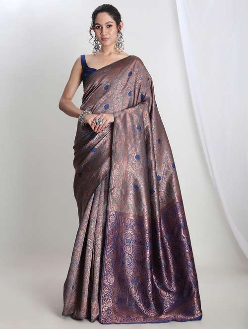 Grace meets tradition in this exquisite grey silk blend jacquard Banarasi saree, adorned with a delicate floral woven pattern all over. The contrast blue-coloured pallu adds a striking touch of elegance, beautifully complementing the rich texture of the saree. Paired with a matching blue-colored blouse, this ensemble is a perfect choice for festive occasions, weddings, and grand celebrations. Drape it effortlessly and complete the look with statement jewellery for a timeless appeal.