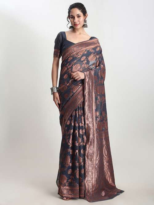 Drape yourself in elegance with this exquisite dark grey silk blend jacquard saree, featuring a beautifully woven floral pattern that adds depth and sophistication. The intricate copper weave enhances its rich texture, while the subtle sheen lends a touch of understated glamour. Lightweight yet luxurious, this saree is perfect for festive occasions, weddings, or evening soirées. Pair it with a complementing blouse and statement jewellery to complete your graceful look.