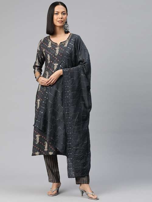 - Find gorgeous sets of ethnic wears in trending designs in grey colors suitable for festive wear of occasions.