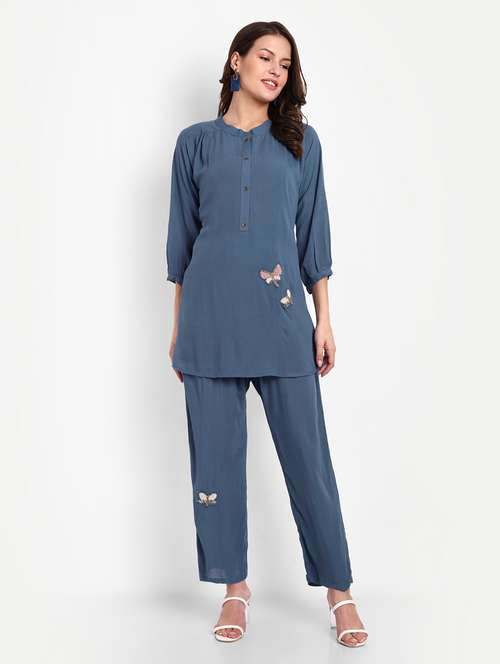 - » blue applique work top and trouser co-ord set