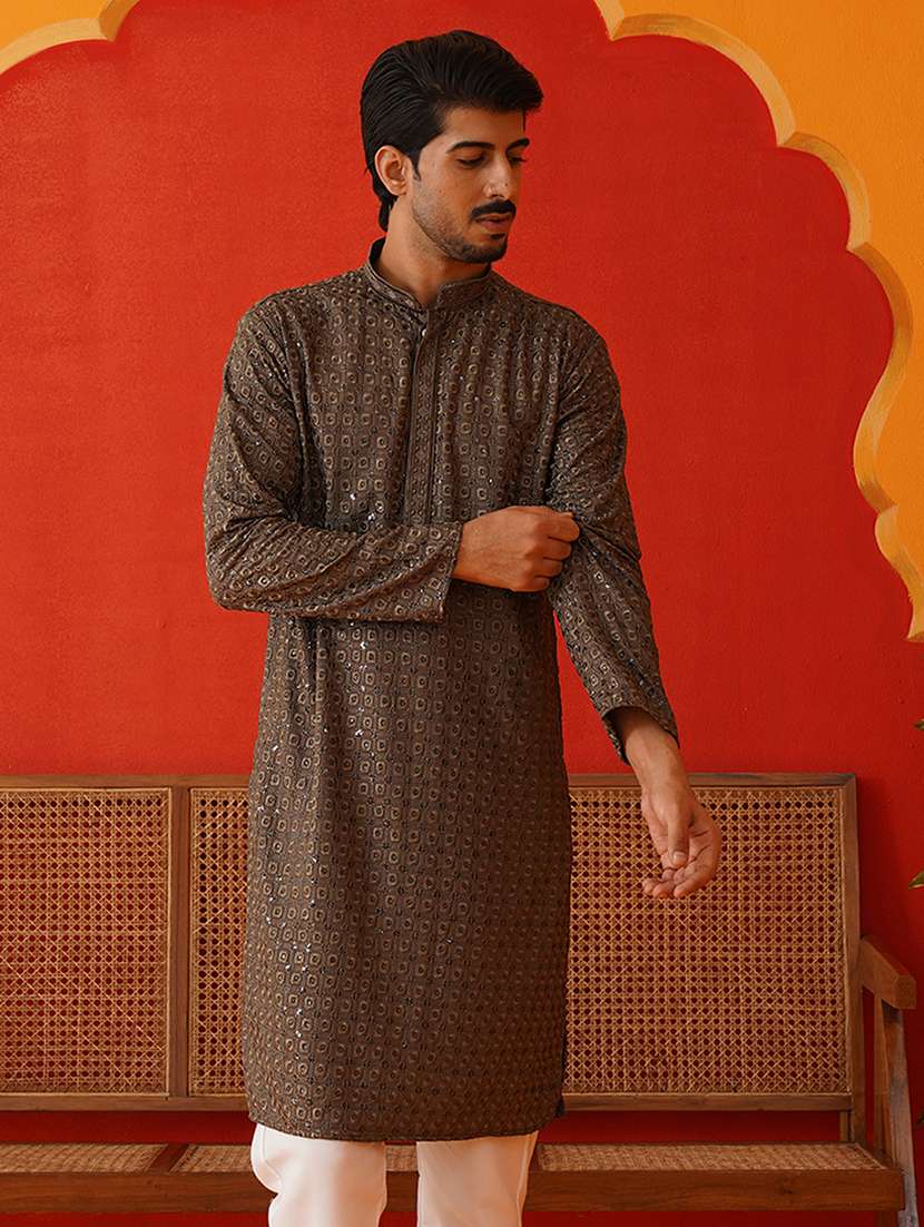 This Dark-Grey Viscose Rayon kurta is perfect for traditional events like festivities, enhanced with embroidery and sequins work. The full sleeves and mandarin collar adds charm to the attire.