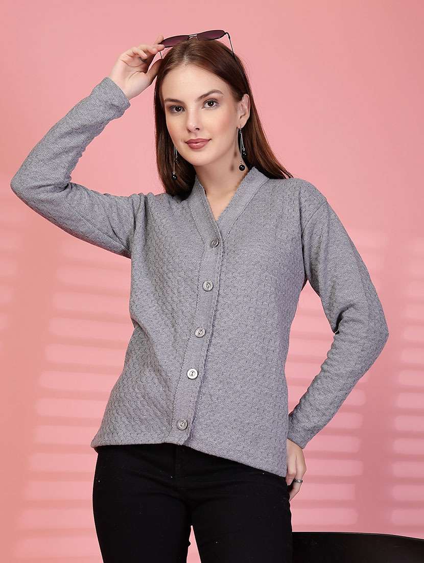 Elevate your winter wardrobe with this sleek Grey button-down woolen cardigan. Designed with a V-neckline and full sleeves, this versatile piece offers both comfort and style. The textured knit fabric ensures warmth, while the classic black color makes it easy to pair with any outfit. Perfect for layering over tops, dresses, or shirts, this cardigan is a must-have for casual outings, office wear, or evening get-togethers.