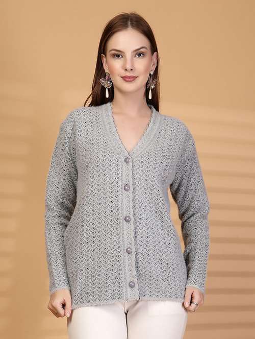 Add timeless elegance to your winter collection with this grey textured button-down woolen cardigan. Featuring a V-neckline and a subtle textured knit design, this cardigan is perfect for layering in the chilly season. The soft wool blend fabric provides warmth and comfort, while the front button closure makes it easy to wear and style. Pair it with jeans, trousers, or jeggings for a versatile winter look that works for both casual and semi-formal occasions.
