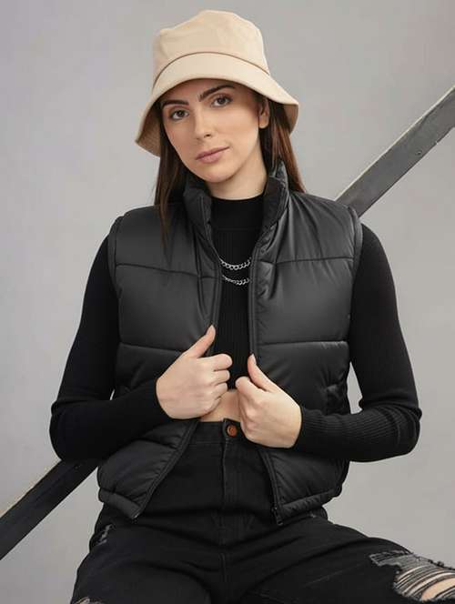 women solid sleeveless cropped puffer jacket