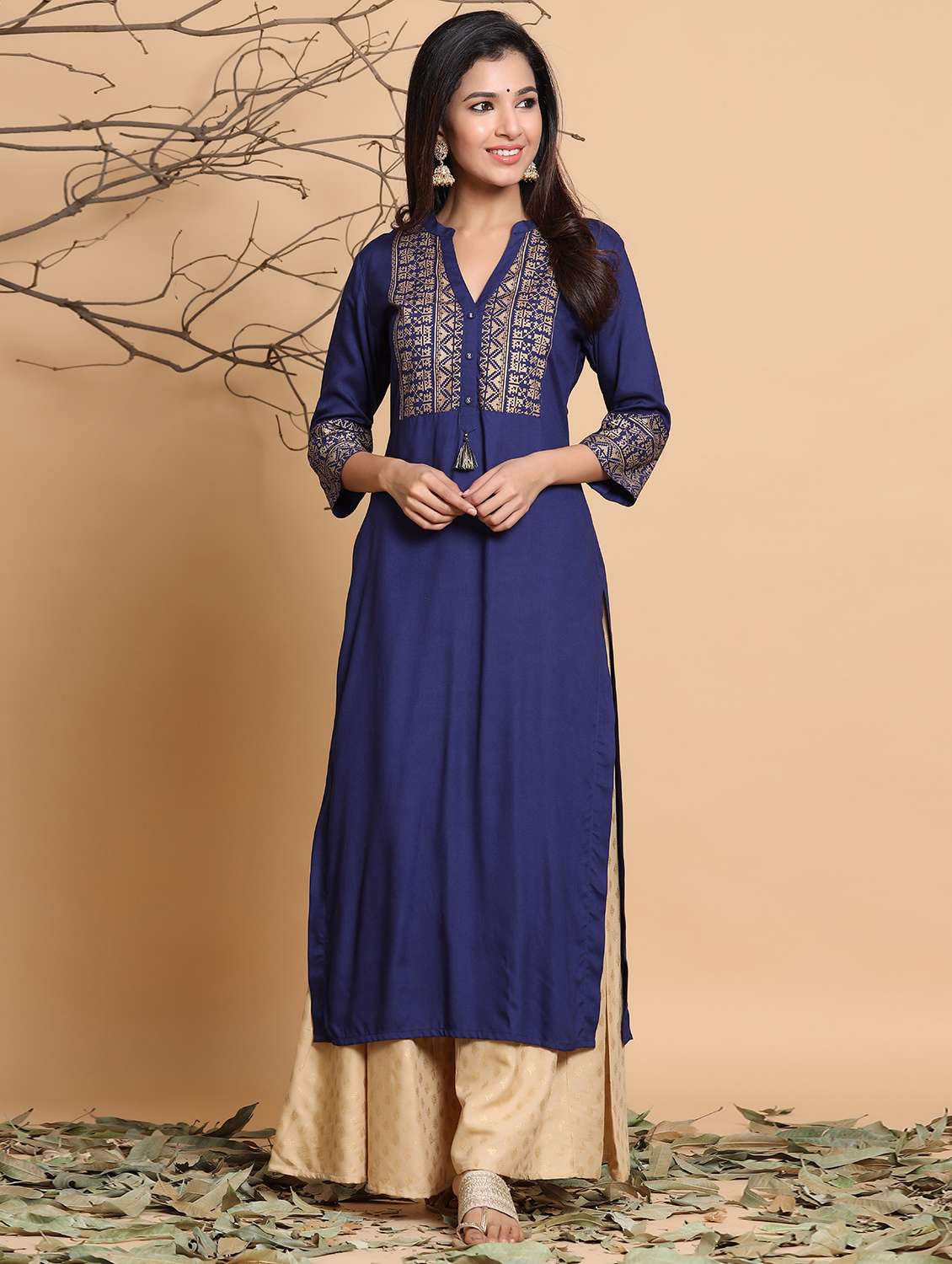 - Grab this beautiful kurta made up of rayon fabric featuring mandarin collar neck designs.