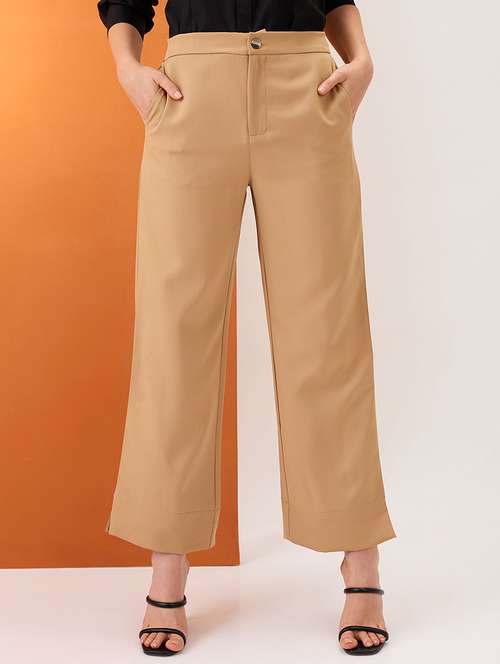 - » women khaki solid mid-rise bottom hem slits relaxed fit formal trousers