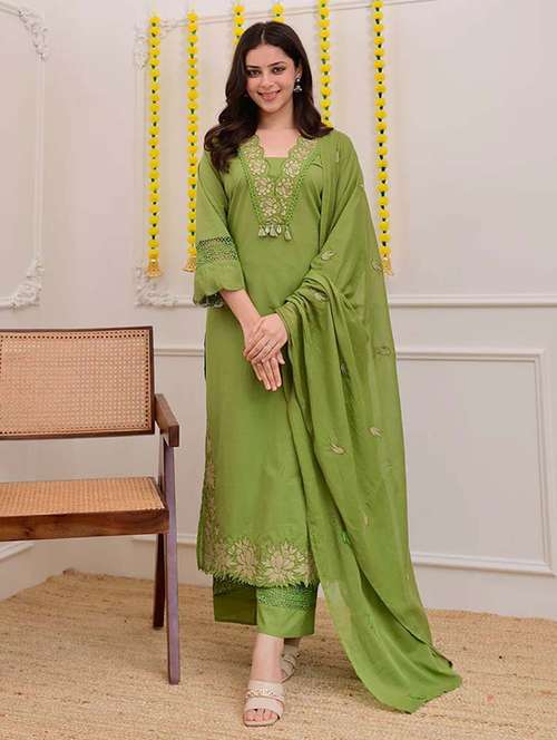 women solid with work three quarter sleeve kurta pant with dupatta set