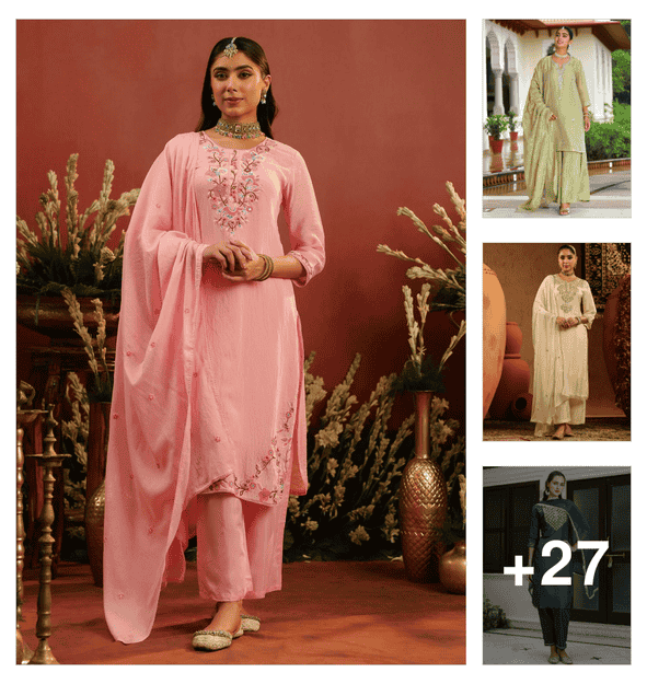 women teal sequinned zari embroidered v-neck bell sleeves kurta with pant & dupatta festive set