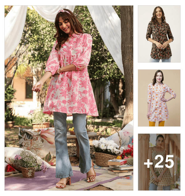 women pink floral print mandarin neck tunic