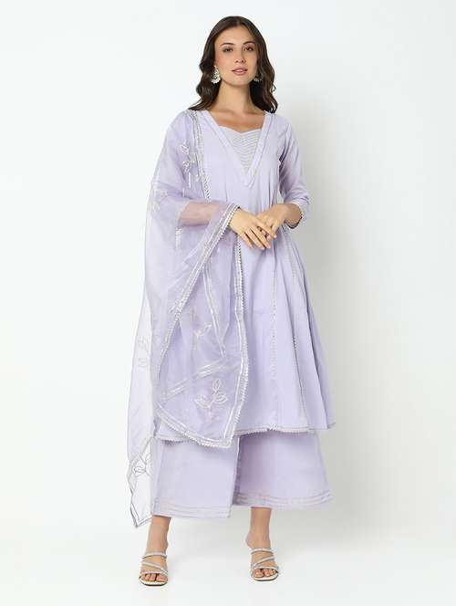 • Find gorgeous sets of ethnic wears in trending designs in lavender colors suitable for festive wear of occasions.