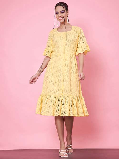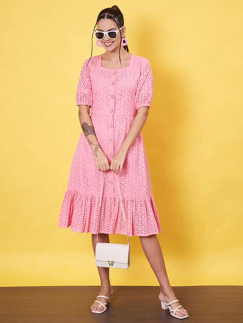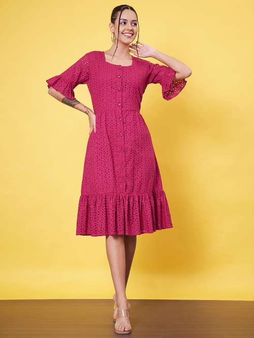 - Dress up in a soothing pattern and don this dress made of cotton material.