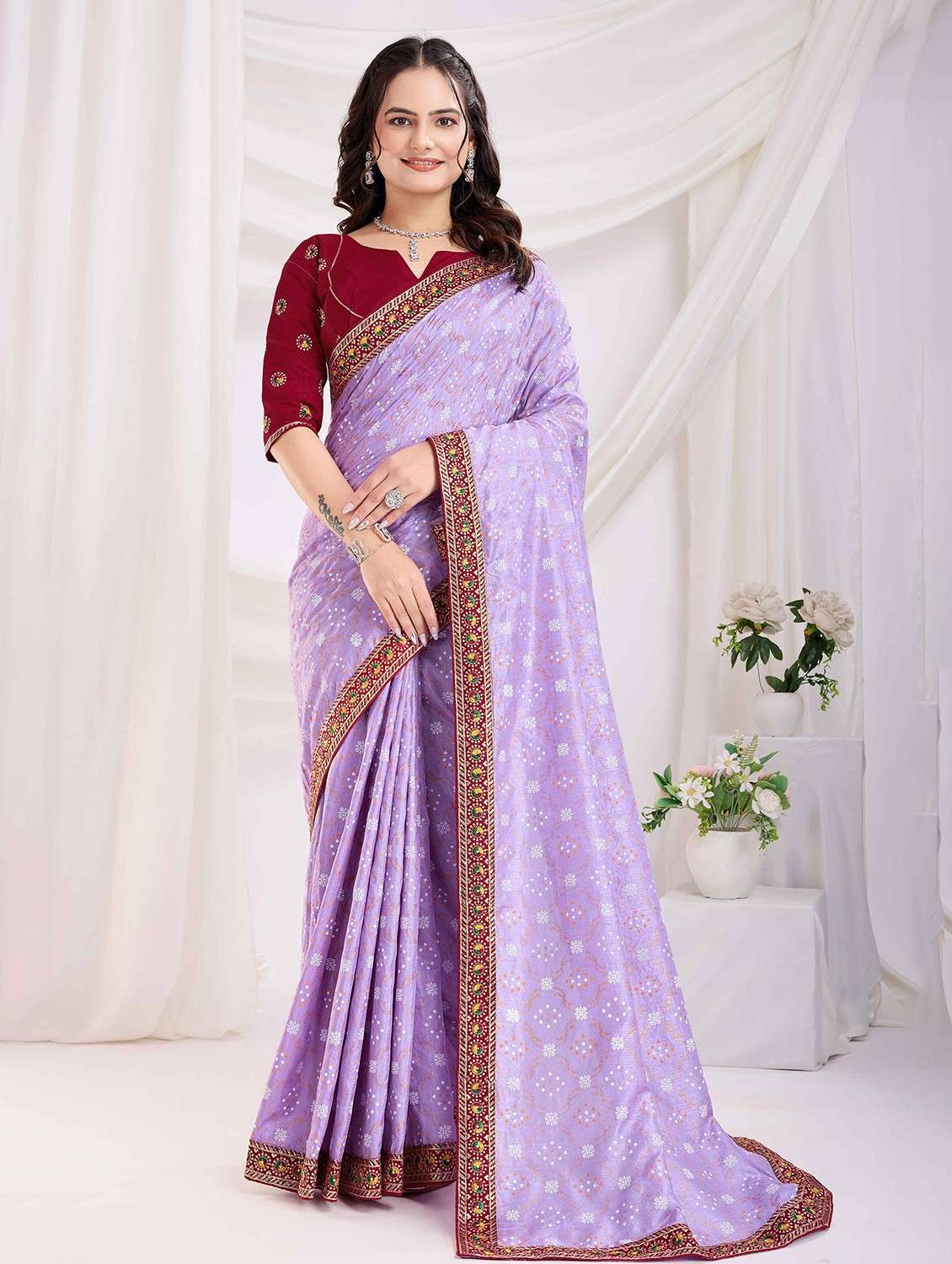 This Lavender vichitra silk saree, adorned with a charming bandhani print and a finely crafted embroidered border for a refined finish. The soft vichitra silk fabric ensures a rich texture and graceful drape. This saree comes with a matching unstitched mono banglori silk blouse piece, allowing you to customize the design to suit your style. Perfect for festivals, family gatherings, and special functions, this saree combines cultural charm with sophisticated appeal.