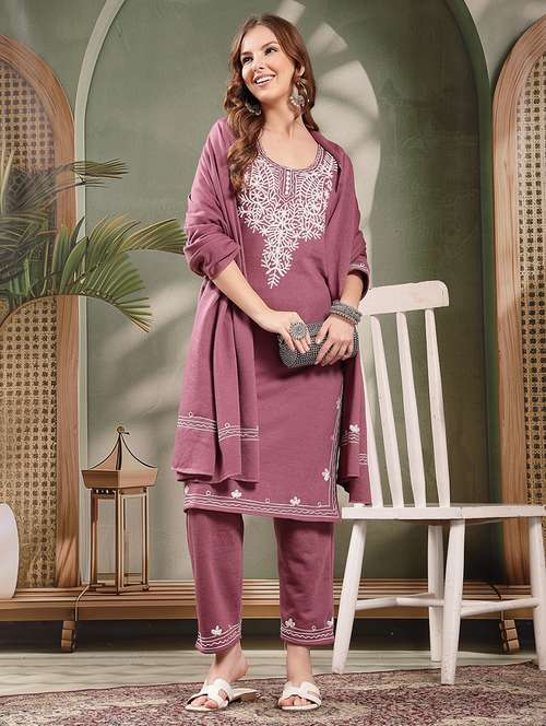- » women embroidered woolen kurta and pant set with dupatta