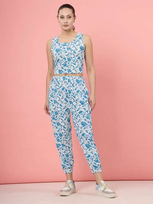 This co-ords consists of a Printed Top with Joggers. Sky Blue abstract printed stretchable sleeveless top has round neck & crop length. Sky Blue abstract printed stretchable joggers has one side pocket, elasticated waistband and slip-on closure.