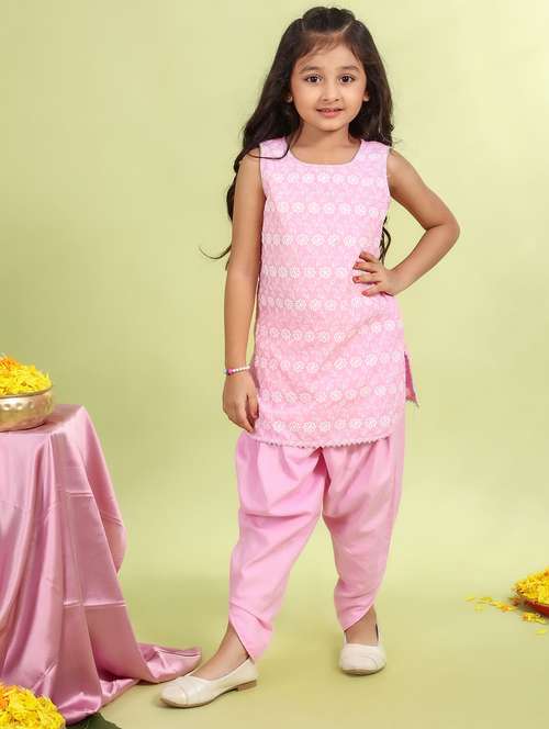 girls embroidered round neck dhoti kurta set