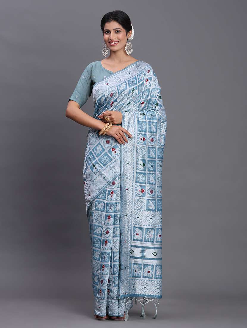 Celebrate heritage in style with this sky blue linen cotton saree featuring a striking grid of multicolor motifs including elephants, temples, and tribal patterns. The intricate woven pallu and border elevate its ethnic charm, while the breathable fabric ensures all-day comfort. Tassel detailing and a contrast blouse piece complete the look — perfect for festive gatherings, pujas, or office ethnic days.