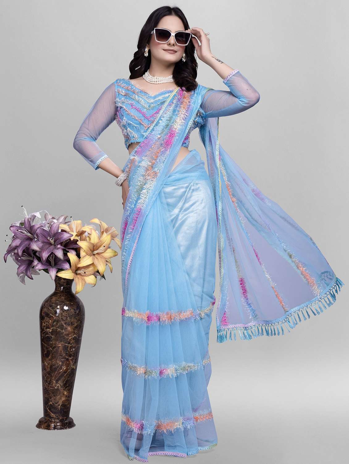 Color : Sky, Made from high-quality Net Fabric Ribin Work Embroidred Saree, giving the saree a stunning look and feel.With a length of 5.50 meters and an additional 0.80 meters of Net unstitched blouse material.Available in various colors, this saree is perfect for weddings, parties, and other special occasions.Please be aware that screen settings or photography lighting may cause tiny variations in the product's colour, and that any additional accessories displayed are solely for modelling.