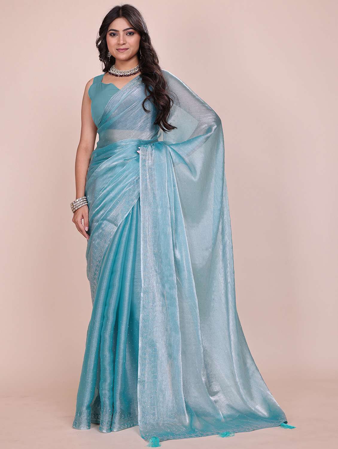 Women's Soft Zimmy Choo Shimmer Chiffon Fandy Silk Saree With Stone Work & Comes With Unstitched Blouse Piece (Chhaava)