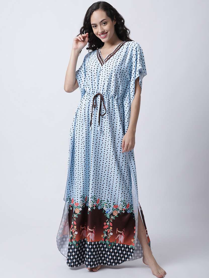 Kaftan nighty comes in free size and completely Fits Up to: Chest-42-44, Hips-44-46, Length-53-54 (In Inches) and has drawstring waist tie whichgives you the freedom to customize the fit to suit your unique shape