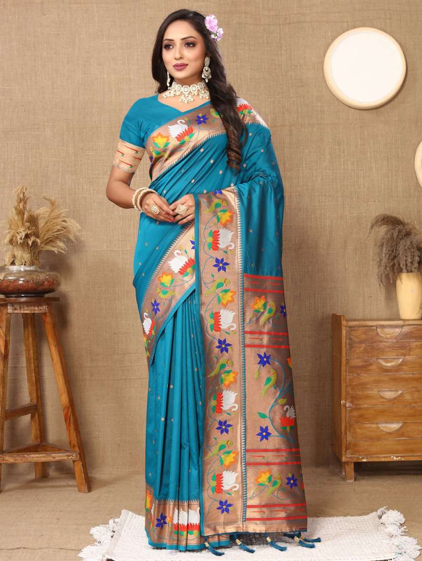 Blue Paithani Silk Saree With Zari Weaving Meenakari Border
