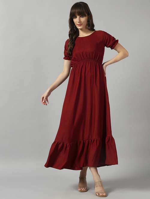 This modern dress comes in Solid long tier dress comes with crossed v neckline and smocking detail at the waist line. The maxi dresses for women western wear has fine gathers on the shoulder which gives it an appeal. This beautiful dress can be worn with a belt to make a more stylish look. It is crafted from polyester fabric.It is a western dresses for women latest design party.