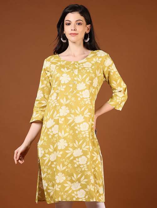 - Grab this beautiful kurta made up of rayon fabric featuring round neck designs.