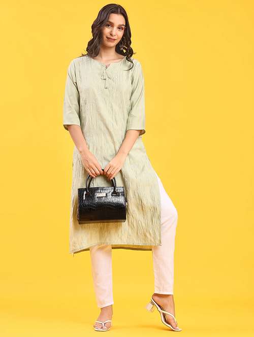 - Grab this beautiful kurta made up of cotton fabric featuring tie-up neck neck designs.
