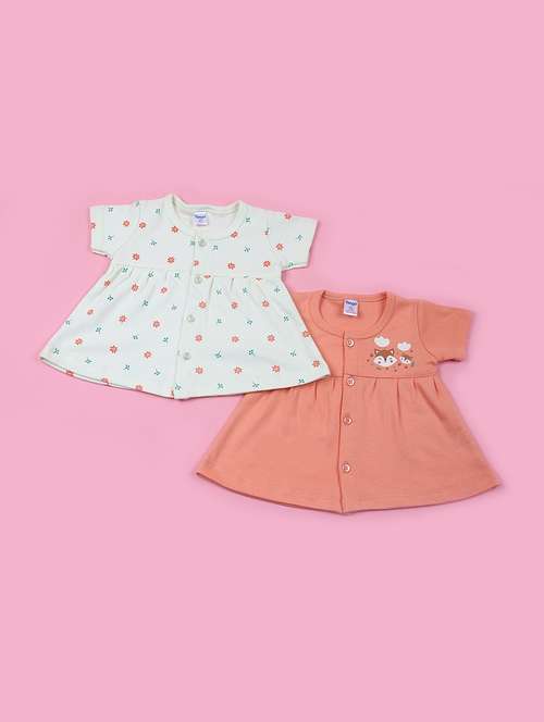 - Dress up your little ones in frocks featuring pretty patterns in cosy material .