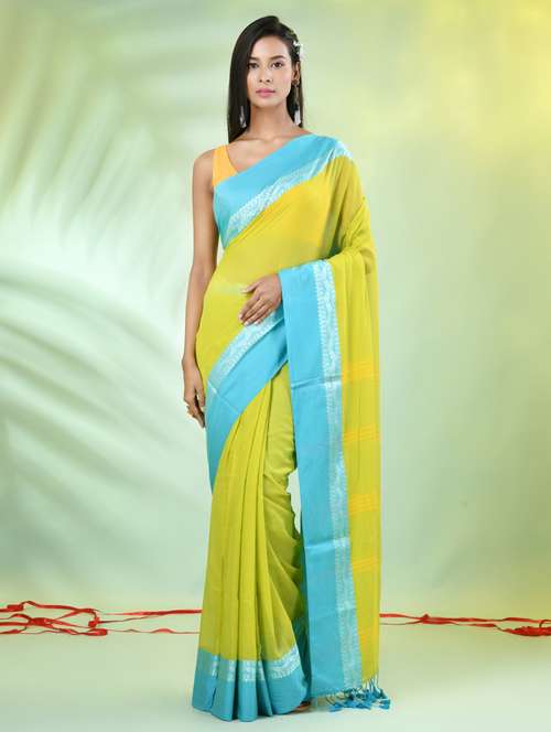 Indulge in eternal grace with our Lime Green Cotton Soft Saree With Contrasted Borders– a delicate fusion radiating timeless charm. Infused with inherent elegance, each subtle drape encapsulates sophistication.