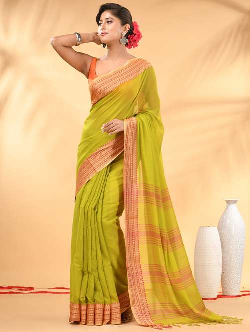 Elevate your ethnic wardrobe with the timeless charm of the Lime Green Soft Mulmul Cotton Saree. Crafted from soft, breathable mulmul cotton, this saree features a soothing lime green base complemented by vibrant borders and a contrasting pallu adorned with traditional woven stripes. Lightweight and elegant, it's perfect for everyday elegance, festive gatherings, or summer occasions. The saree drapes effortlessly, offering comfort without compromising on style.