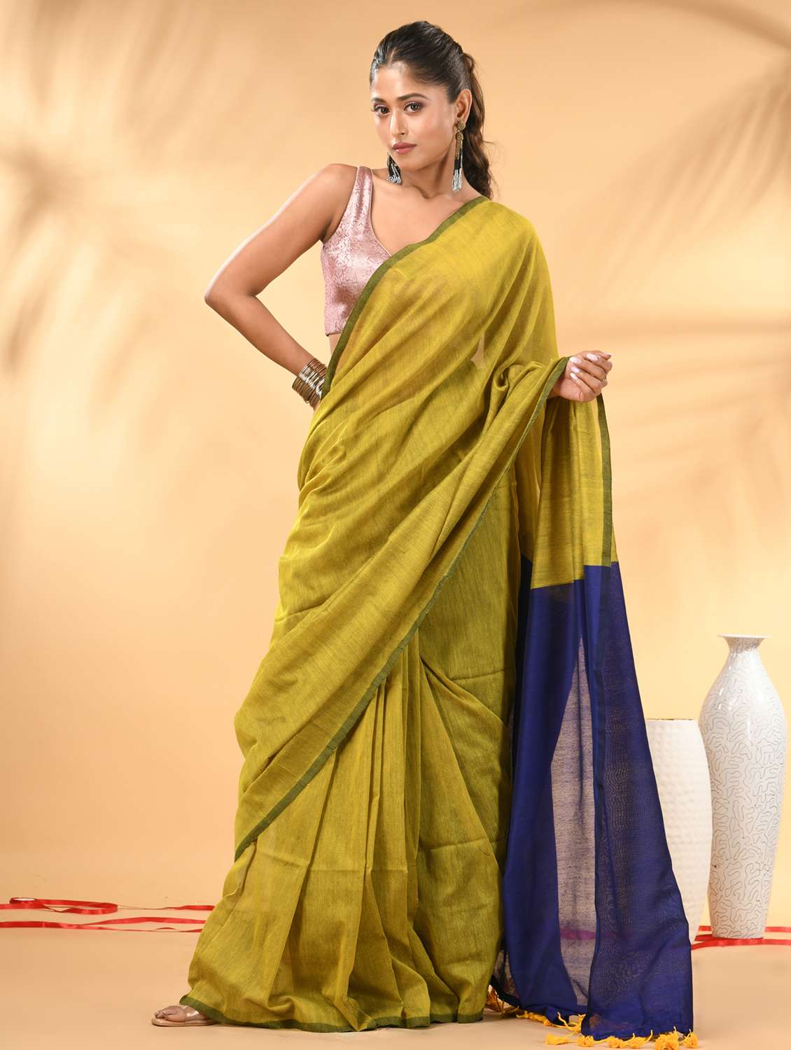 Celebrate timeless elegance with this beautifully crafted cotton handspun saree, designed to elevate your wardrobe. The saree features a stunning combination of lime green and blue hues, seamlessly blending contemporary style with traditional charm. Its lightweight, breathable cotton handspun fabric ensures comfort all day long, making it perfect for both festive occasions and daily wear. The saree is adorned with delicate tassel detailing on the edges, adding a touch of sophistication. Pair it with traditional jewelry for a complete look.
