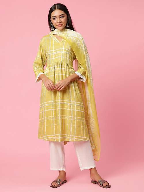 - Find gorgeous sets of ethnic wears in trending designs in yellow colors suitable for casual wear of occasions.
