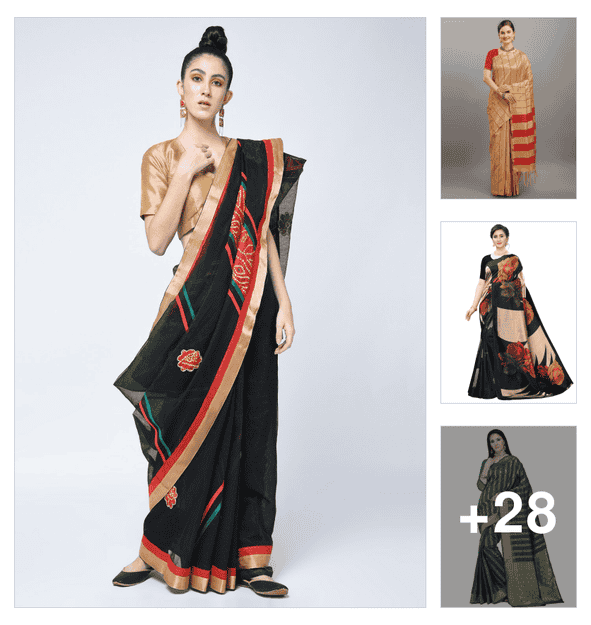 cotton sarees in the stunning black colour. You can work them up with your plain blouses. You will find both solid and printed numbers in our collection.