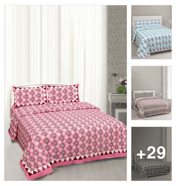 uniqchoice pink color 100% cotton jaipuri traditonal double bedsheet with 2 pillow cover