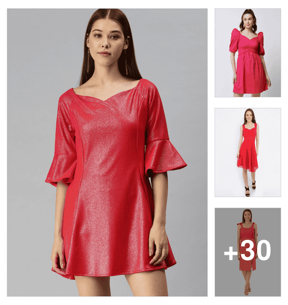 globus women red v-neck bishop sleeves solid schiffli detail tiered midi a-line party dress with belt