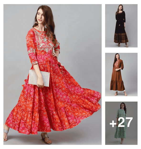women printed three quarter sleeve tiered kurta