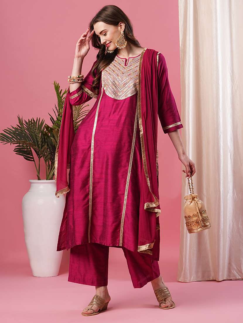 - Find gorgeous sets of ethnic wears in trending designs in magenta colors suitable for festive wear of occasions.