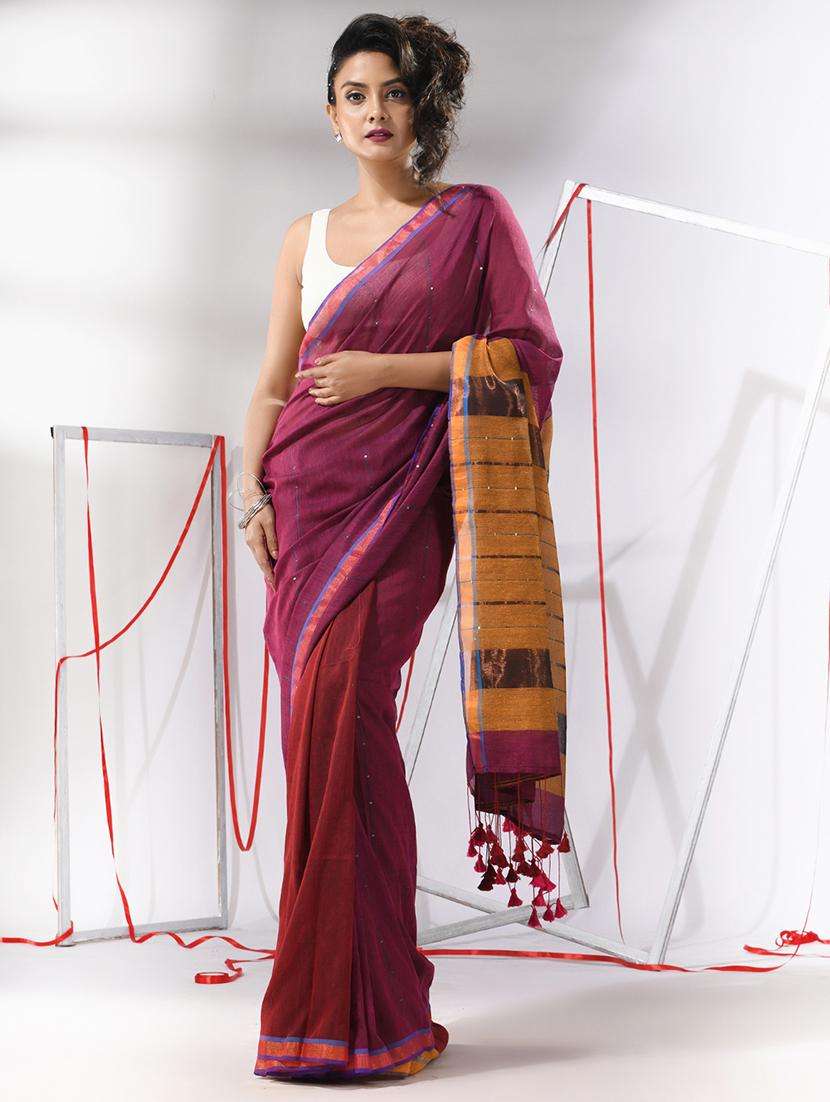 Look royal and loving in this magenta cotton soft saree. It has woven designs and patterns for a beautiful look.