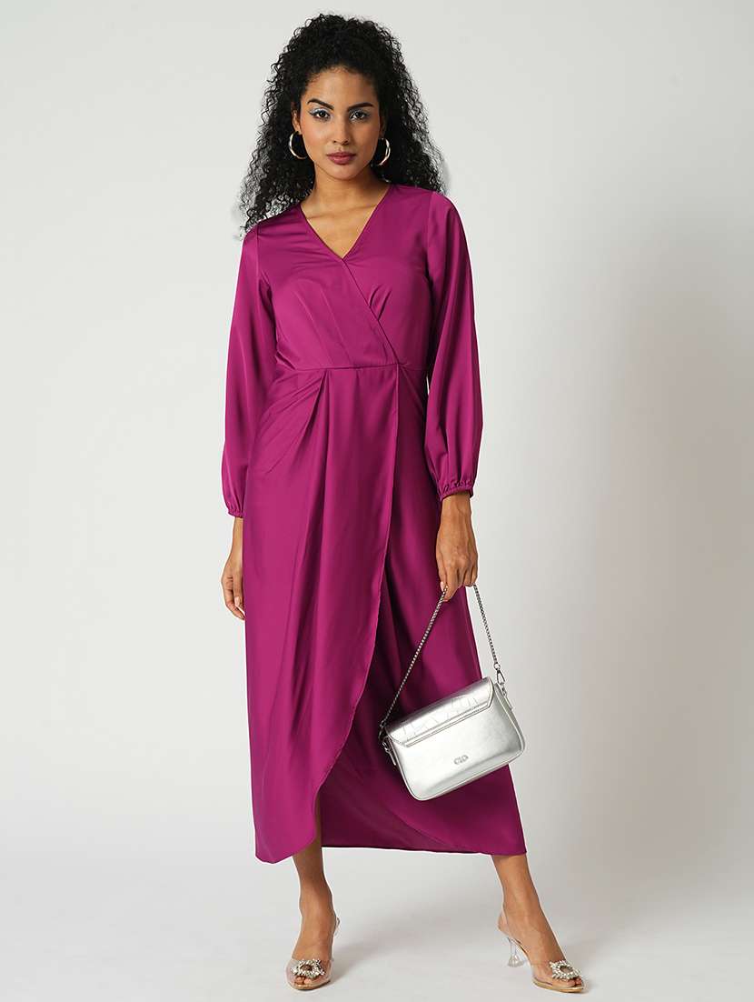 - » globus women magenta wrap neck full sleeves tulip hem satin midi sheath party dress