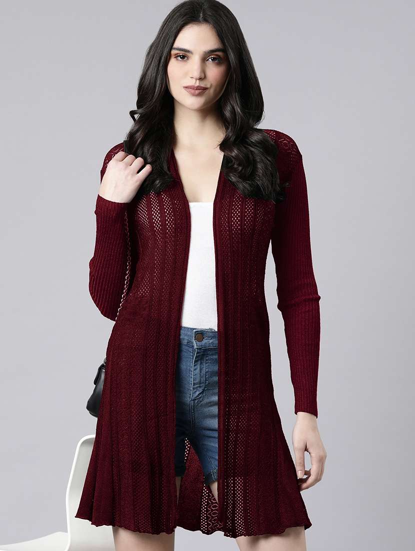 women maroon solid long sleeves shrug