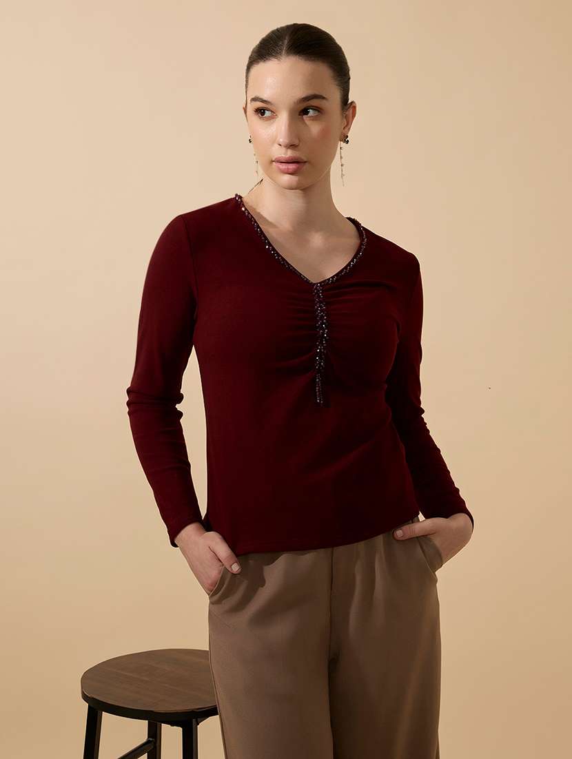 - » women maroon solid long sleeve regular top