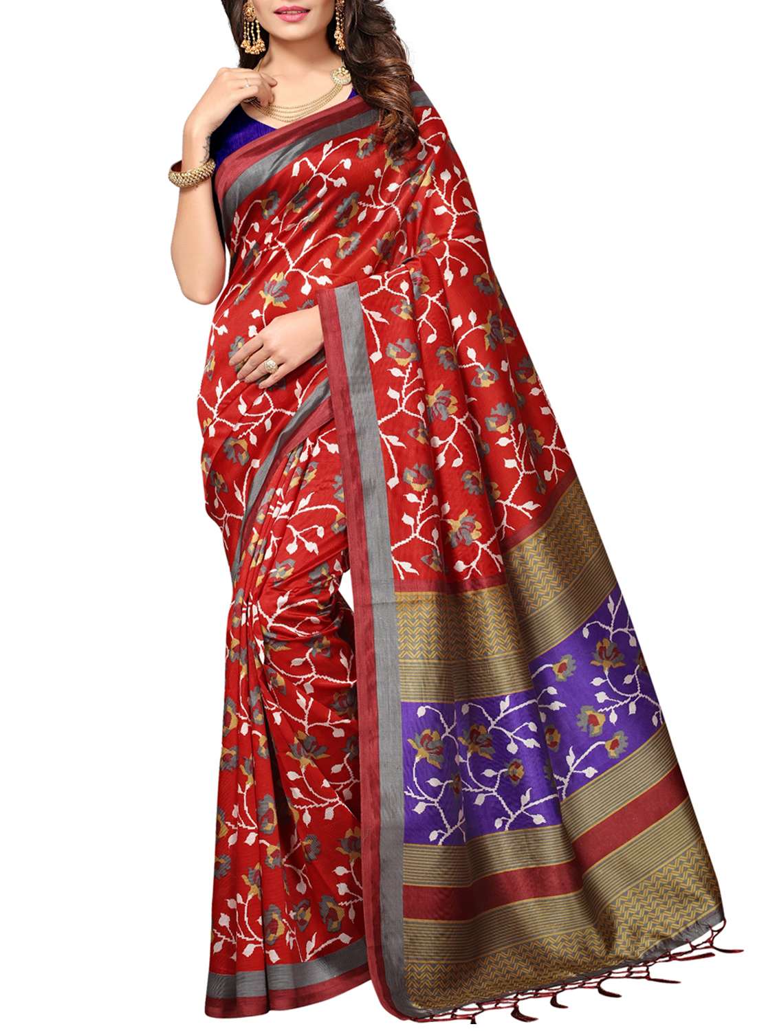 red art silk printed saree with blouse