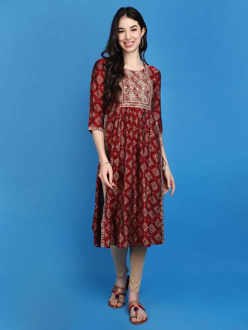 - » women maroon round neck a-line kurta