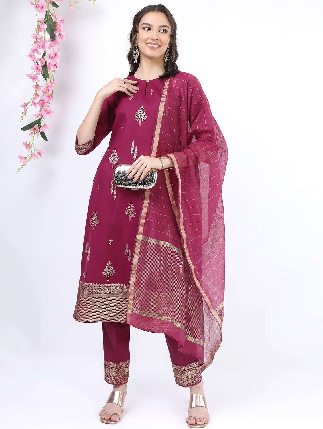 women maroon kurta pant set with dupatta